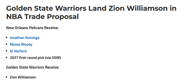 这份具体方案是勇士送出库明加、穆迪、霍福德和2027年的首轮签,从鹈鹕换来锡安。Piercey还从双方角度分析为什么可以做这样一笔交易。